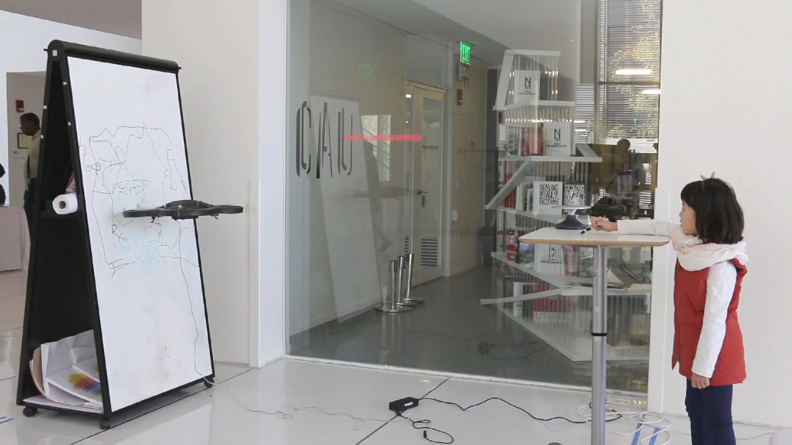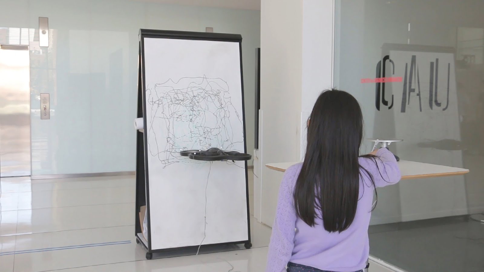 The seemingly straightforward technical realization is in fact a combination of non-trivial mechanical and algorithmic solutions. The drone, a floating machine, is relying on a slim chance of stabilization acquired by battling the vortex of air, the pressure and friction on the canvas surface, and the capricious mind of the human artist. This suspense, the vulnerability to instability and the aftermath of crashing, poses a contrast with the optimistic idea of technologically evolved capability of a human artist.